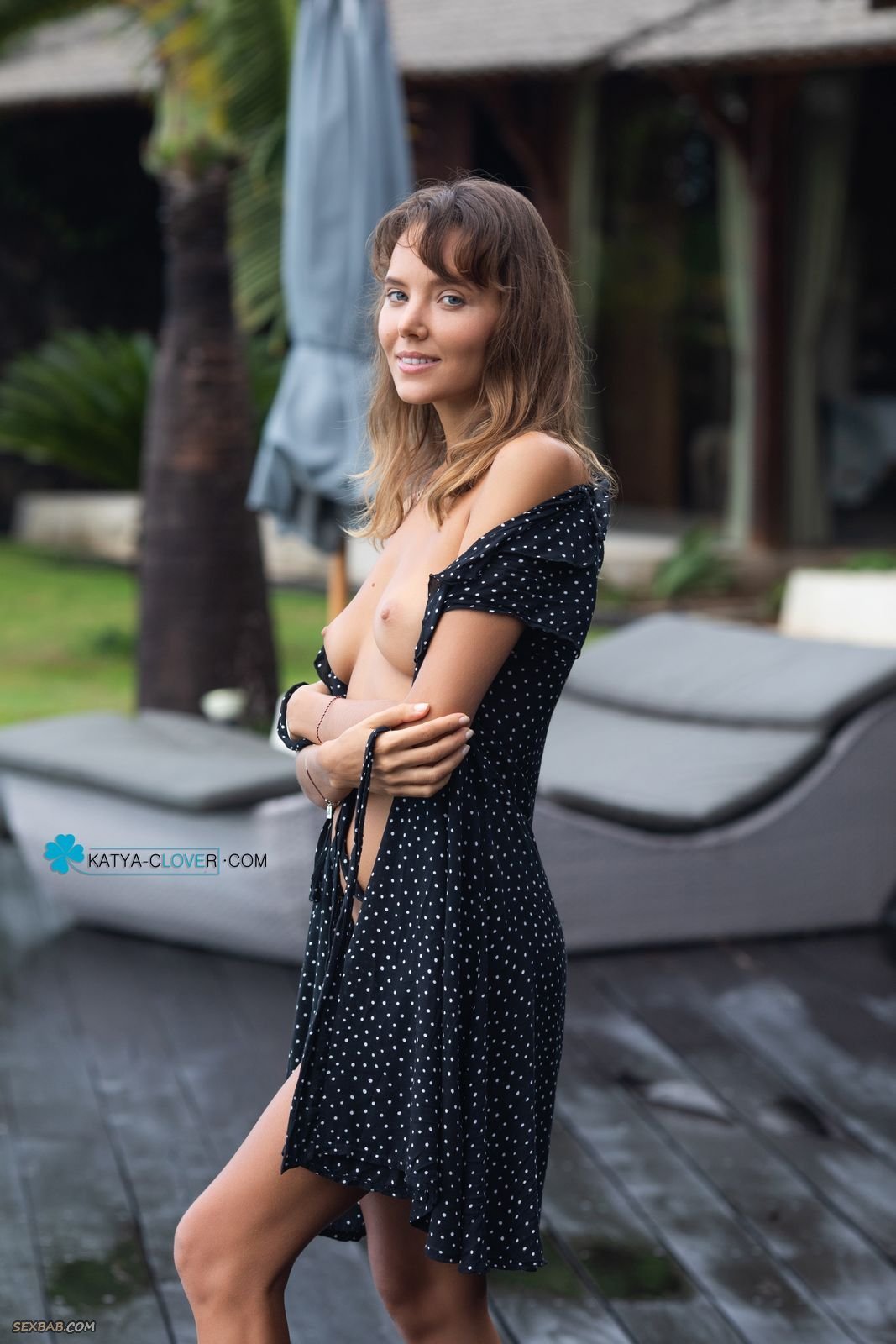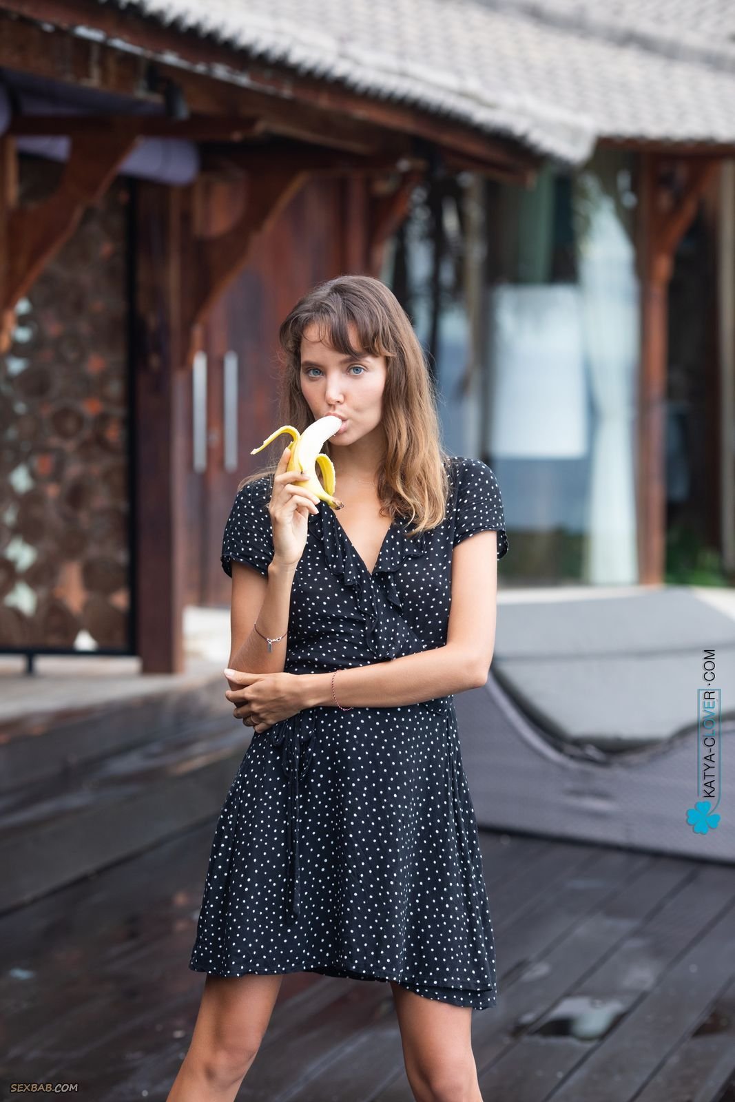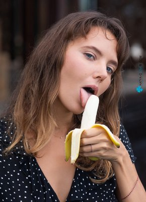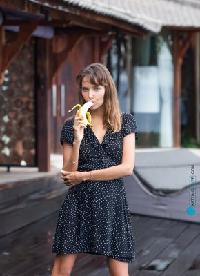 Описание: Эротично облизывая и посасывая спелый длинный банан, сексуальная кокетливая дамочка в платье решительно распахнула его перед камерой и оголила свои натуральные прелести. Раздевшись до гола, загорелая чертовка с красивую упругой попочкой тут же принялась позировать всем телом у большого бассейна и с самых возбуждающих ракурсов засвечивать свою бритую пухлую киску между ног.