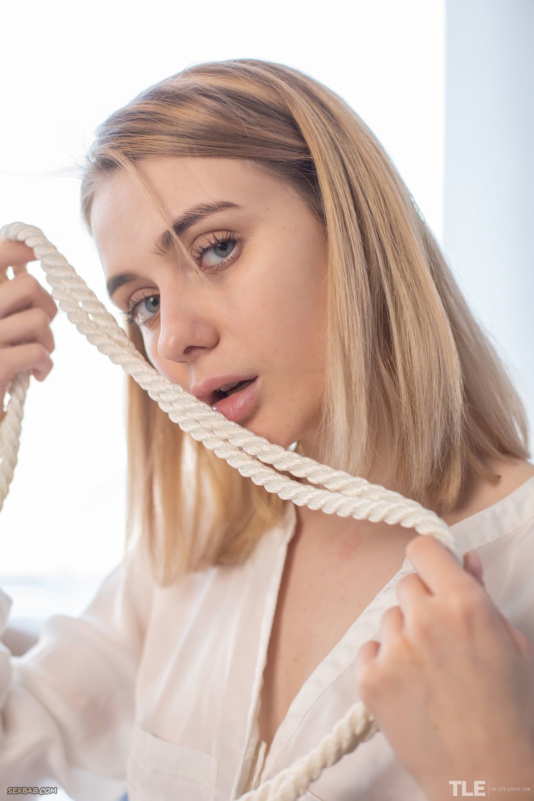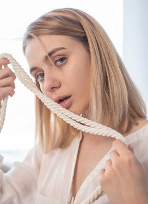 Описание: Красивая молодая девушка со скромным взглядом в чулках, стягивает со своего очаровательного тела короткую юбку и блузку с трусиками, после чего связывает себя канатом, что бы порадовать нас бандажом. А кувыркаясь на диване, сексуальная красавица со светлыми волосами и небольшими титьками позволила разглядеть получше её попку с бритой писькой.