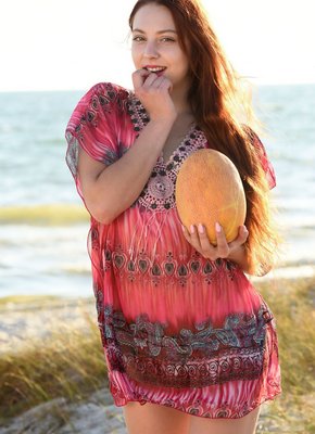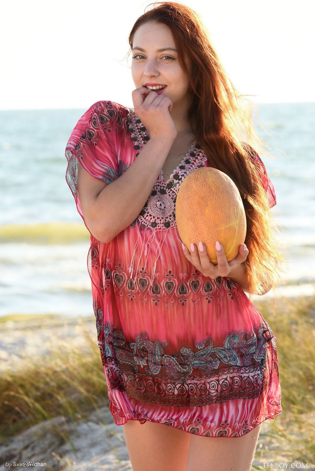 Описание: Аппетитная рыжая тётка в легкой накидке без белья эротично разделась до гола на пляже и принялась возбуждающе есть перед камерой сочную сладкую дыню. Голая баба с маленькими титьками расслабленно лежит на горячем песке и развратно раздвигает свои ноги в разных позах, засвечивая бритую пизду с большими половыми губами.