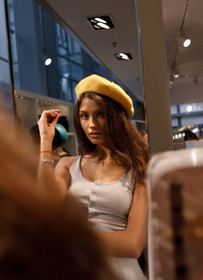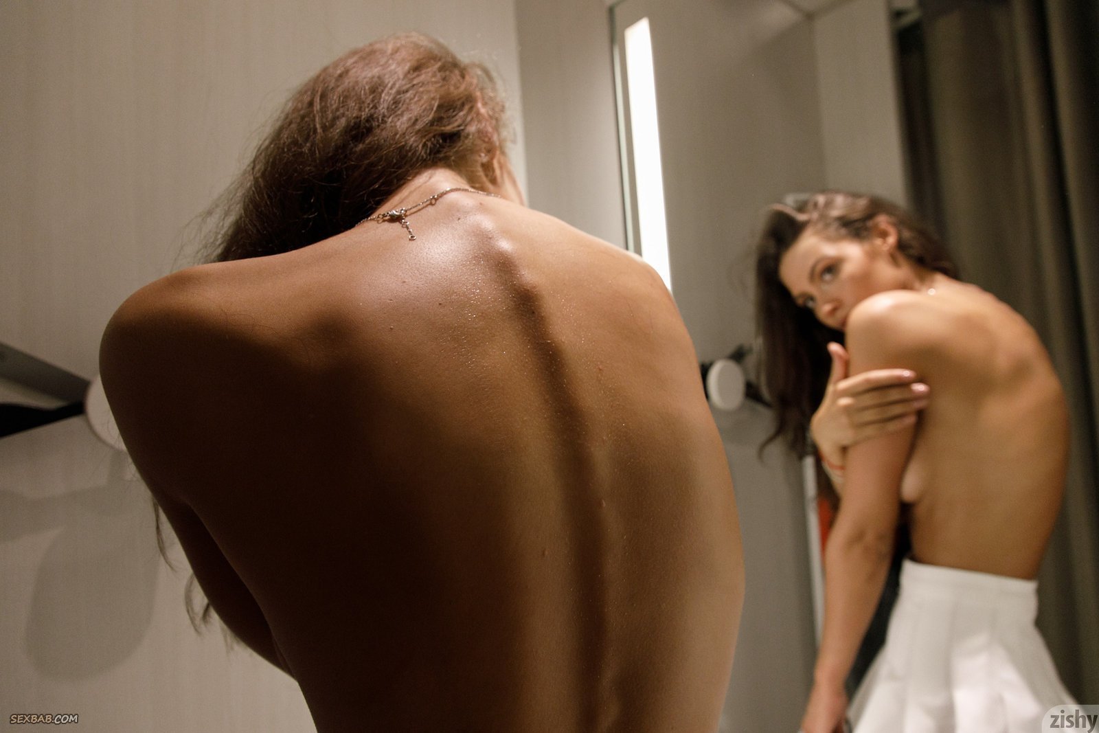 Описание: Выбравшись на прогулку и отправившись в торговый центр, сногсшибательная красотка с худым сексуальным телом задирает там юбку перед камерой и демонстрирует белые трусики под ней. А в какой-то момент стройная худышка закрывалась в примерочной и зажигательно продемонстрировала натуральные сиськи красивой формы.