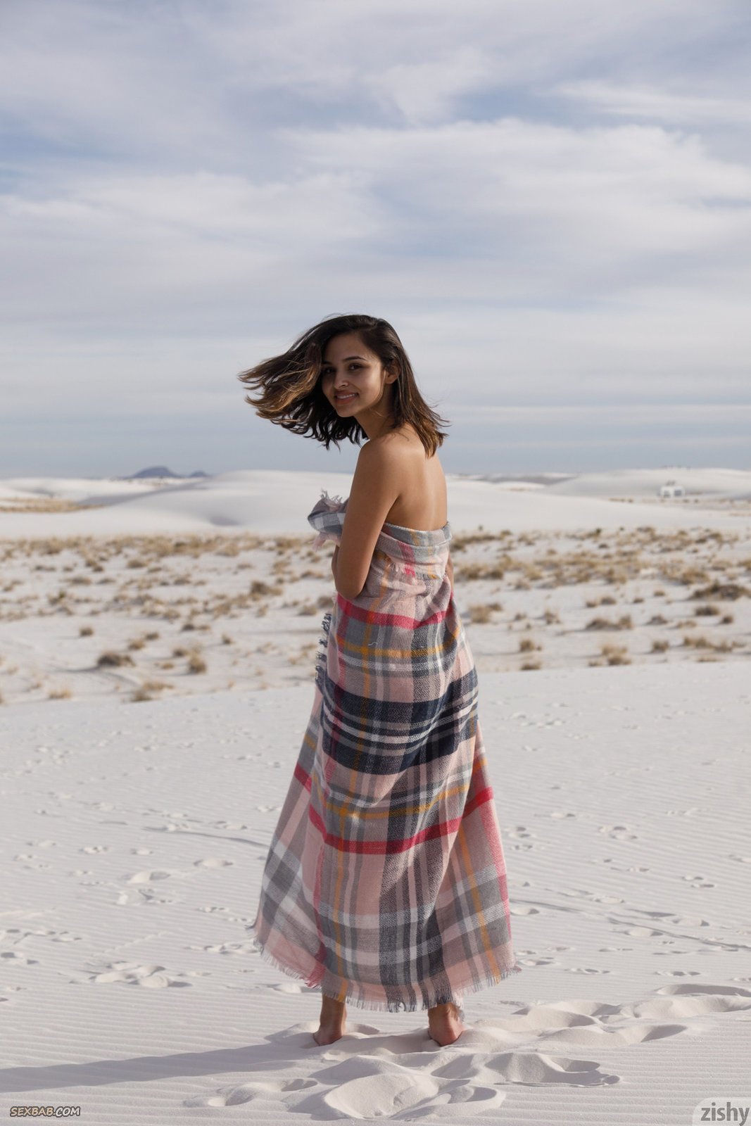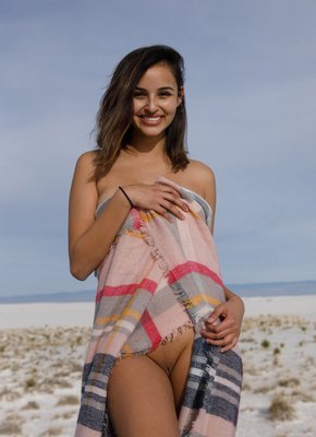 Описание: Обнажив перед фотокамерой своё стройное тело, очаровательная голая девушка позирует в пустыне, соблазнительно кривляясь на белом песке. Красавица позволяет насладиться нам прекрасными видами, демонстрируя при этом подтянутую попку, грудь небольшого размера с красивыми сосками и бритую киску.