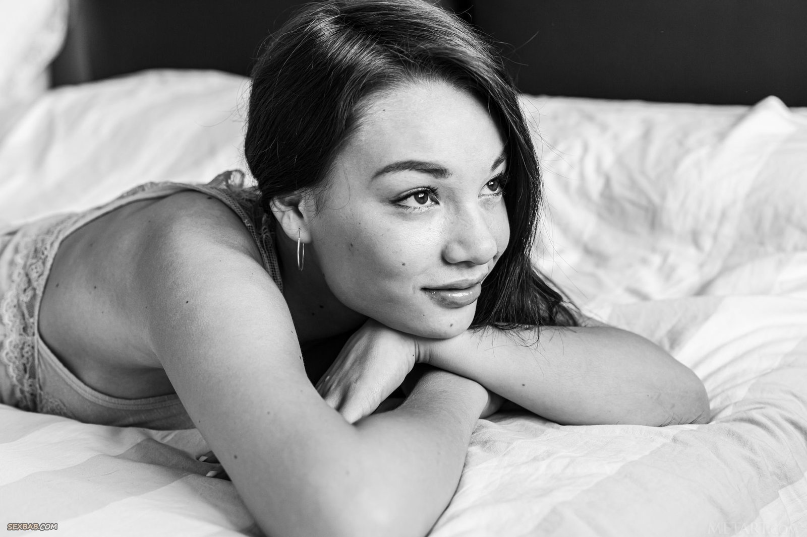 Описание: Устроившись в постели, обнажённая девушка с наслаждением позирует для сексуальной чёрно-белой фото сессии в стиле ню, выгибаясь и нежно поглаживая плечи руками. Обольстительная красавица дразнит нас своим восхитительным телом, представляет на обозрение упругую грудь внушительного размера, бритую киску и прочие прелести.