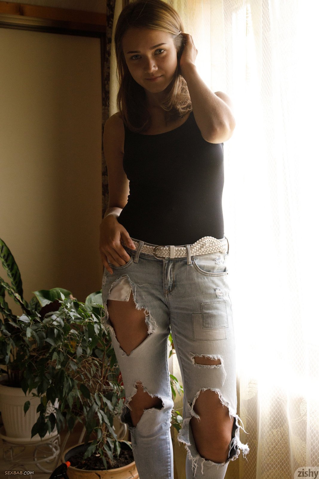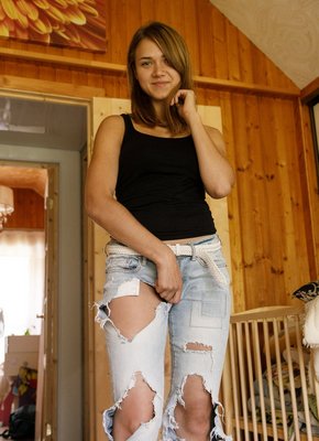 Описание: Привлекательная молодая девка с худенькой фигурой, нарядившись в рваные джинсы и майку принимается эротично позировать дома. Располагаясь на кровати, сексуальная стройняшка немного засвечивала трусики через дырки, ощущая от происходящего возбуждение и удовольствие.