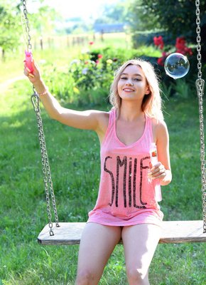 Описание: Очаровательная нежная блондинка в розовой майке без трусиков, устроившись на качели в парке, завораживающе позирует и улыбается нам. Испытывая сильное удовольствие от происходящего с ней, стройная девушка в какой-то момент скинула с себя все лишнее и засветила упругие сиськи с вожделенной писькой.