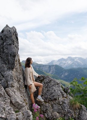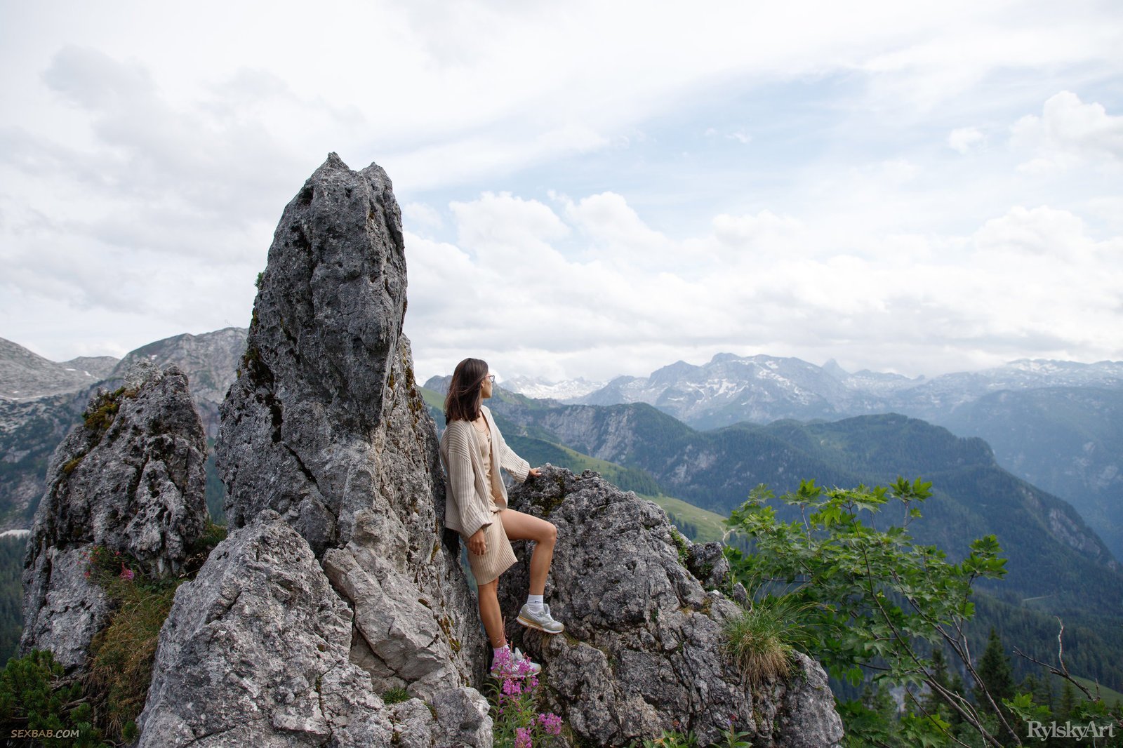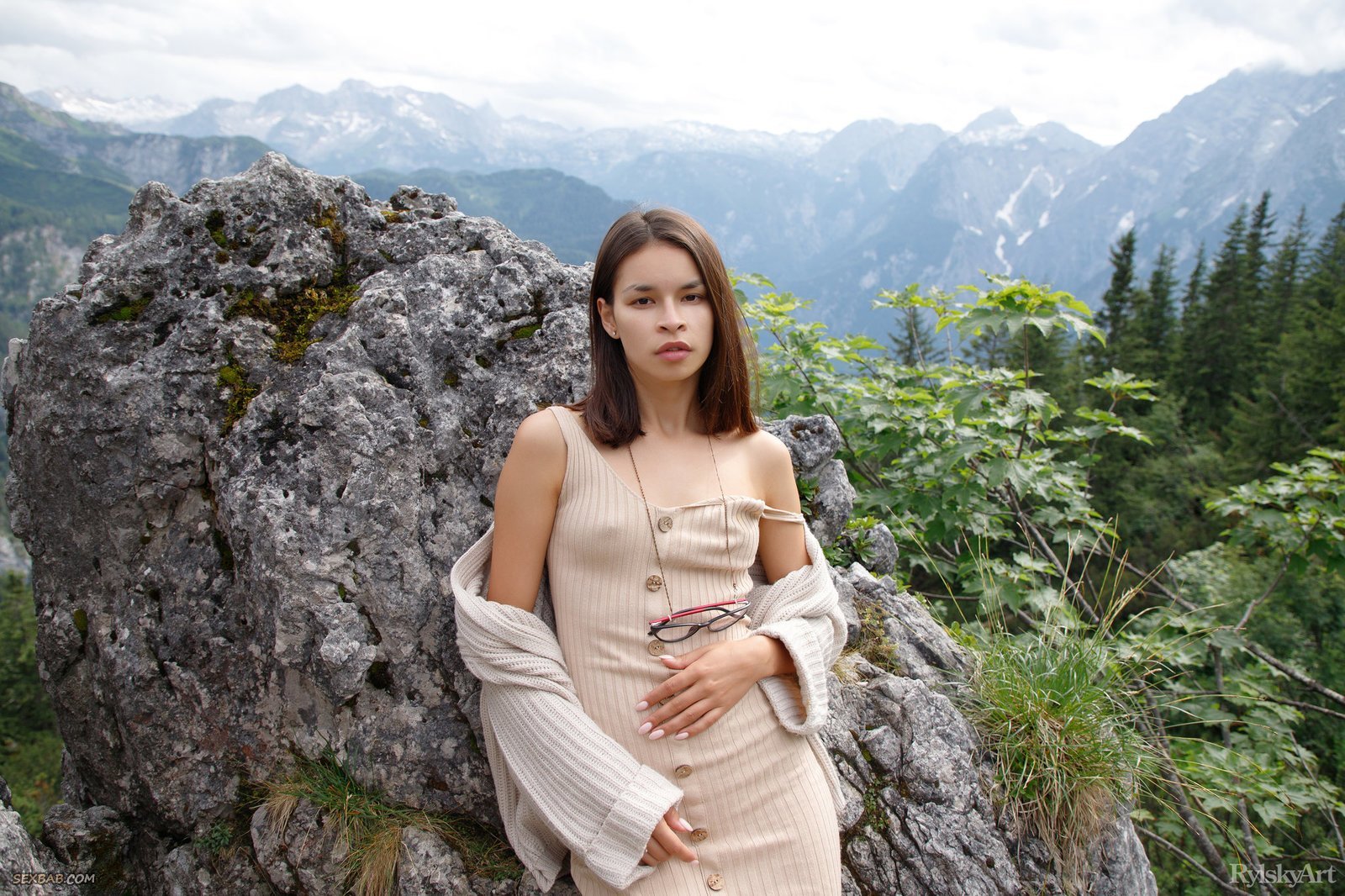 Описание: Молодая очкастая девица с маленькими сиськами едет в фуникулере в гору, игриво задирая юбку платья и показывая своим соседям голую бритую промежность. Обнаженная девушка на фоне природы начинает красиво позировать с широко раздвинутыми ногами, засвечивая на камеру гладкую маленькую киску.