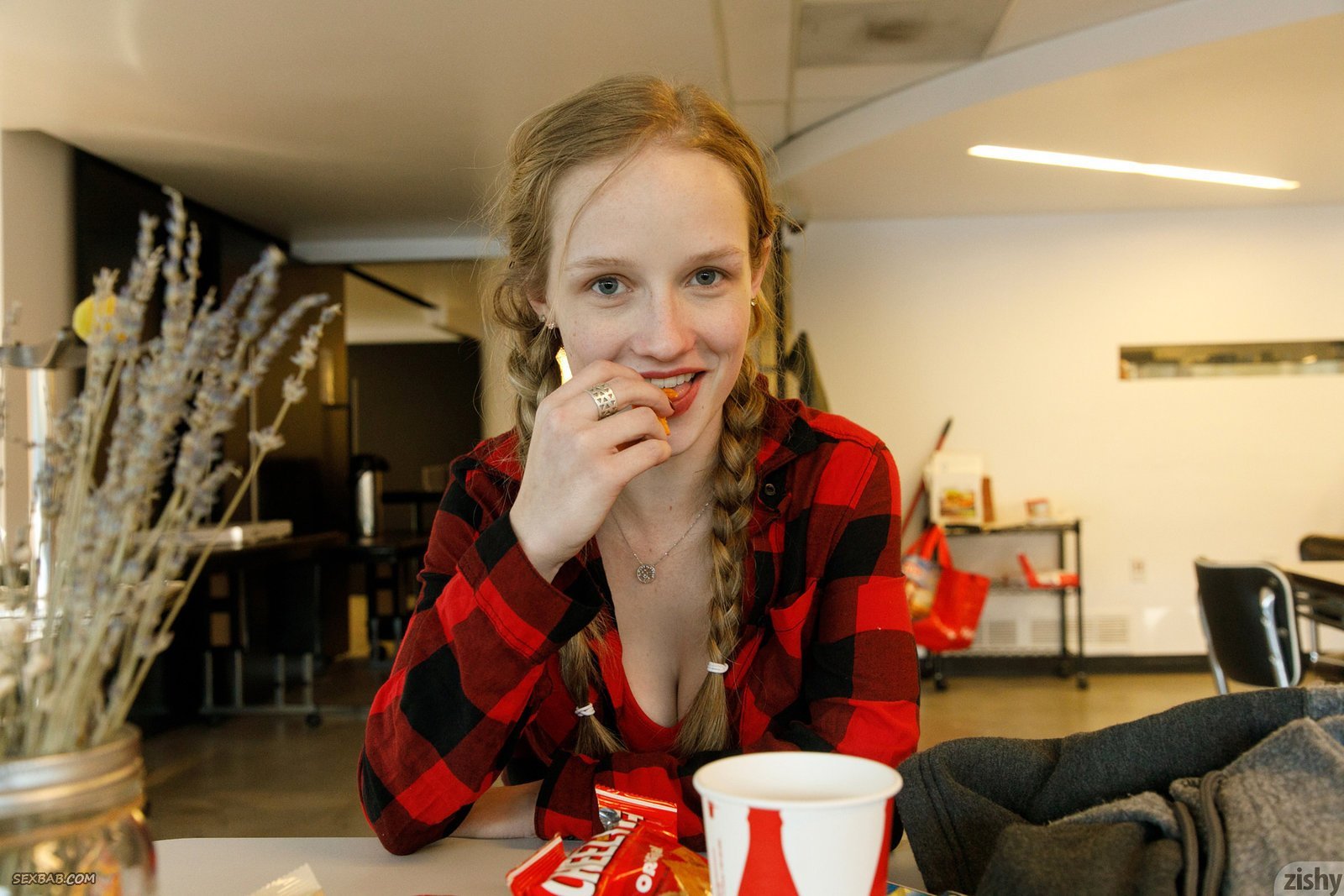 Описание: Перекусив в кафе и отправившись на прогулку, привлекательная девушка в клетчатой рубашке и с волосами завязанными в косички мило улыбается и ощущала желаемое удовольствие, в процессе стараясь засвечивать торчащий сосок на натуральной груди. Параллельно сексуальная милашка так же демонстрировала плоский животик.