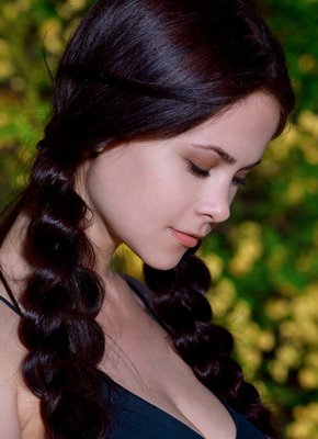 Молоденькая брюнетка позирует голой на природе