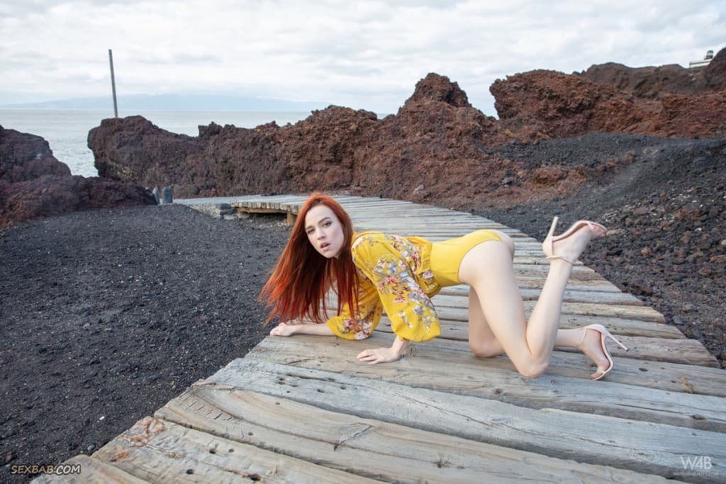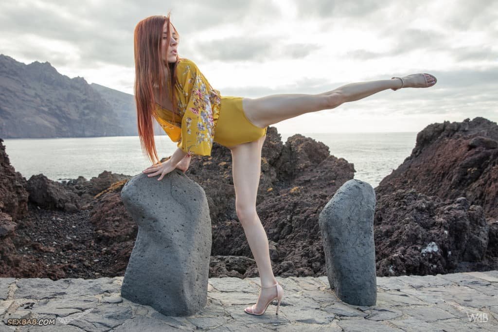 Описание: Найдя уединенное место, тощая рыжая сучка в желтом костюме хочет расслабиться и, чтобы ничего ей не мешало, танцует голой. Девушка грациозно и изящно поднимает свои длинные ноги так высоко, что хорошо видно ее голую бритую киску, а затем она с удовольствие засовывает в нее свои длинные влажные пальчики.