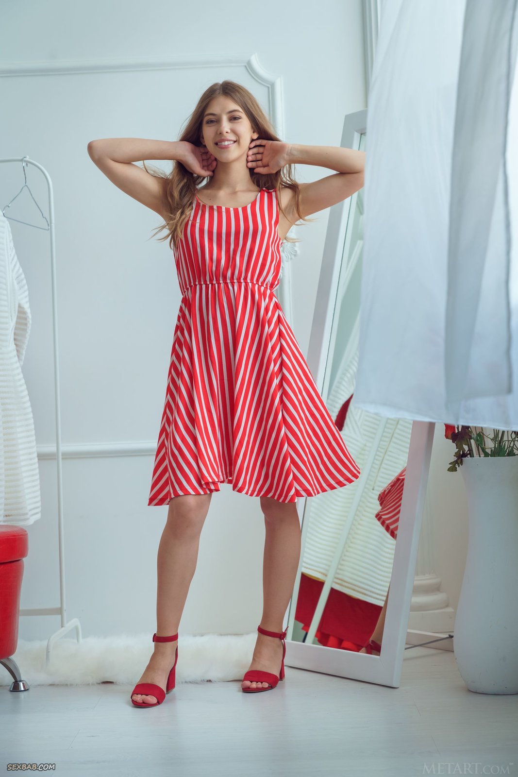 Описание: Молоденькая веселая девушка в белых трусах крутится у зеркала и кокетливо задирает длинное платье, позволяя нам насладиться всеми прелестями которые спрятаны под его подолом. Вскоре обворожительная красавица и вовсе разделась до гола, подробно демонстрируя маленькие сиськи и возбуждающую письку с гладеньким лобком.