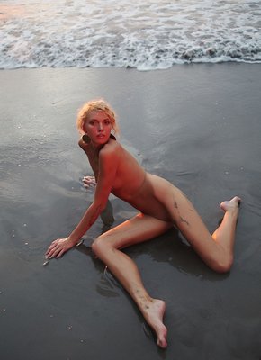Описание: Полностью обнажённая и невероятно жаркая блондинка со стройной фигурой и плоскими сиськами, устроившись на на пляже на берегу моря, в лучах заката начинает соблазнительно демонстрировать себя с разных ракурсов перед фотокамерой. В процессе влажная блондинка грациозно раздвигает промежность и засвечивает бритую письку, параллельно возбуждающе приоткрывая ротик.