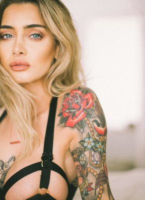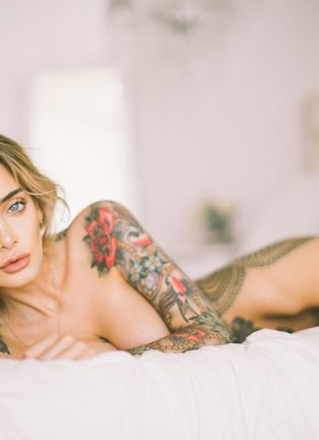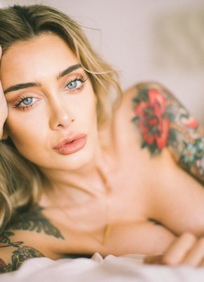Описание: Лишённая комплексов, грудастая блондинка исколотая татухами по всему телу с наслаждением позирует на кровати, где снимая свой лифчик она обнажает перед нами большую натуральную грудь. Пытаясь казаться скромной, красотка с пухлыми губами, впрочем, не боится и скидывает трусики, при этом таки не показывая своего главного достоинства...