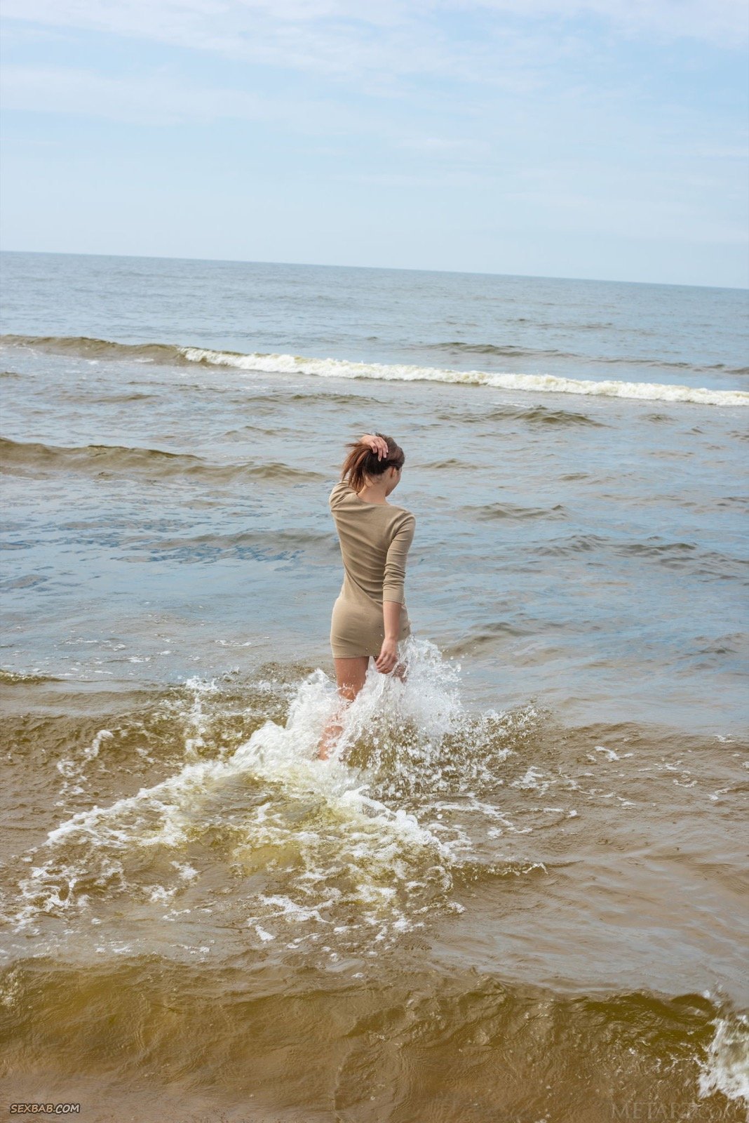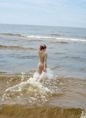 Описание: Намочив ноги в море, привлекательная красотка с упругой попой в дальнейшем эротично снимает с себя облегающее платье и белые трусики на пляже. Обнажив своё потрясающее тело, сексуальная дамочка вскоре устраивается на покрывале и с профессионализмом показывает нам свои небольшие сиськи с торчащими сосочками и бритую письку.