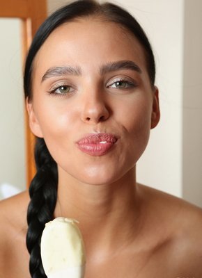 Описание: Усевшись на тумбочке, абсолютно голая и невероятно сексуальная брюнетка с длинной заплетённой косой и пухлыми губками соблазнительно лижет мороженное перед камерой. Между тем, красавица охотно позволяет нам полюбоваться её небольшой грудью и прочими прелестями обнажённого тела.