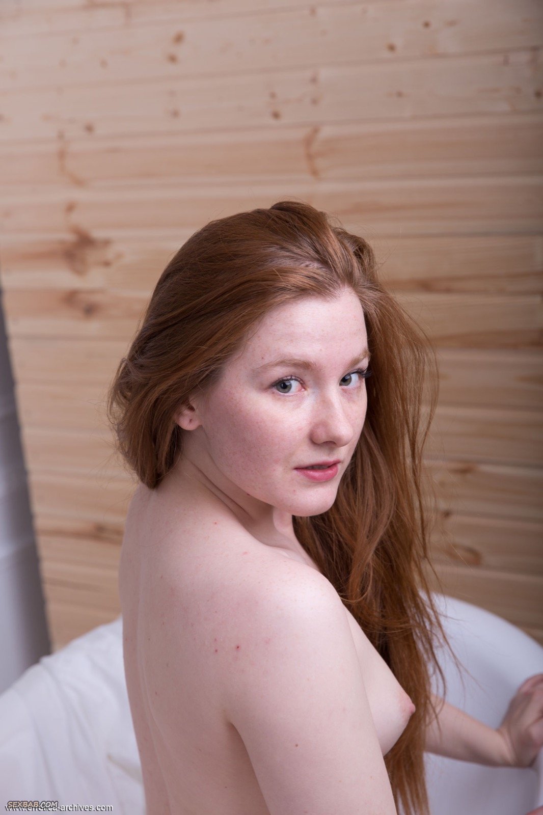 Описание: Скинув белую рубашку, симпатичная рыжая девка с широкой голой жопой и плоской грудью, забравшись в пустую ванную, эротично позирует и засвечивает бритую письку с волосатым лобком. Наслаждаясь происходящим, сексуальная красотка грациозно прогибалась раком и строила глазки.
