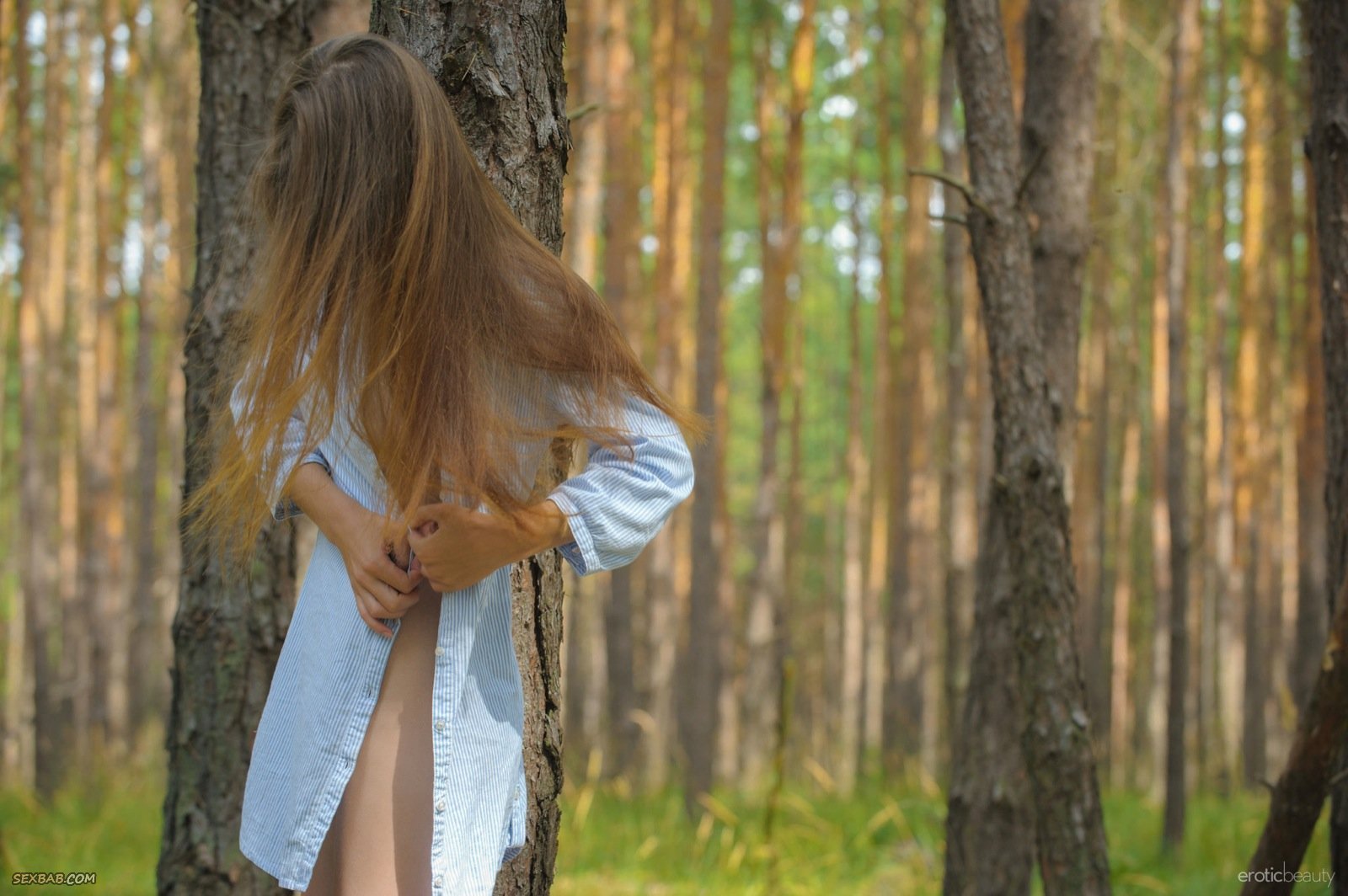 Девица в рубашке на голое тело позирует в лесу