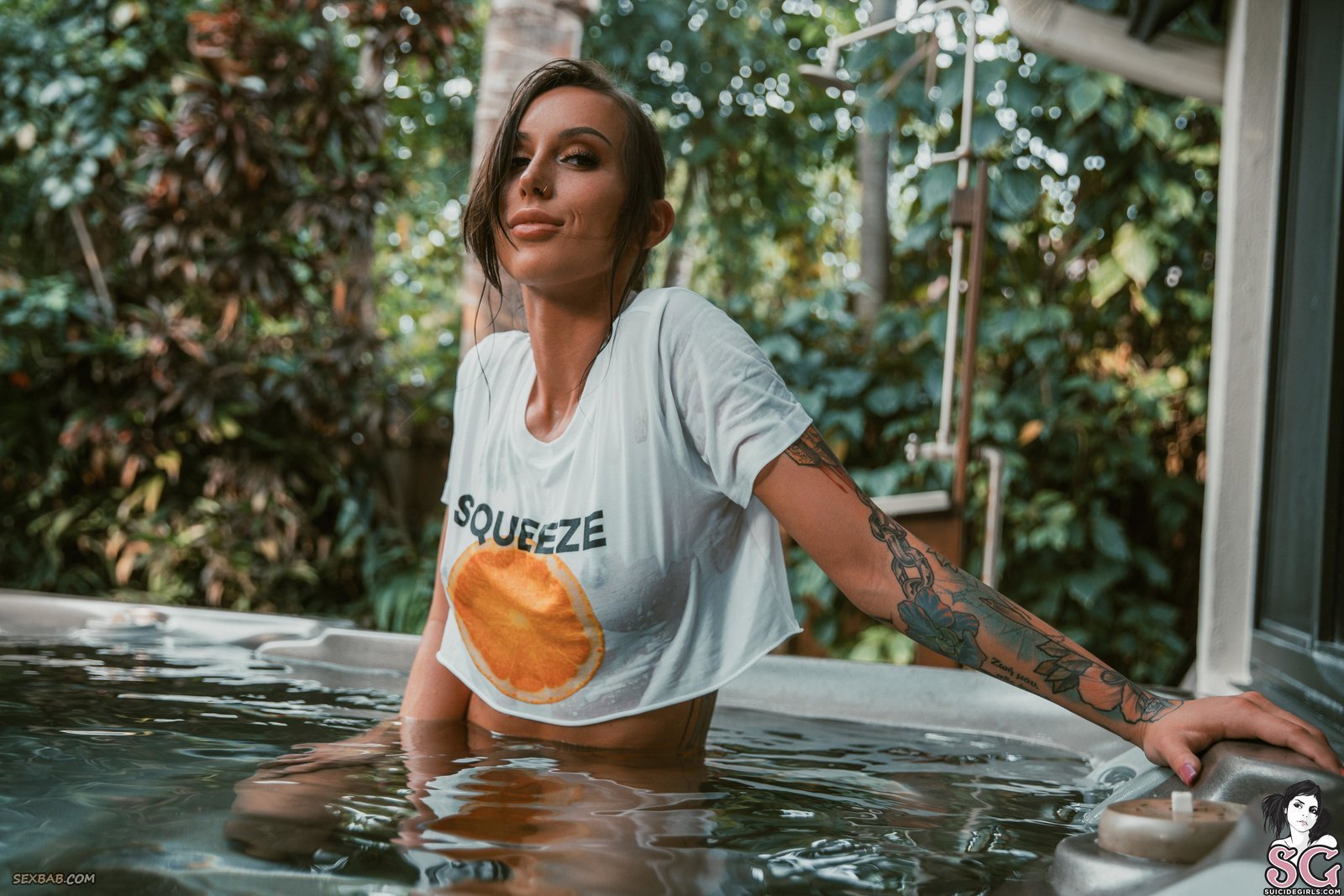 Девушка в трусиках и футболке в джакузи