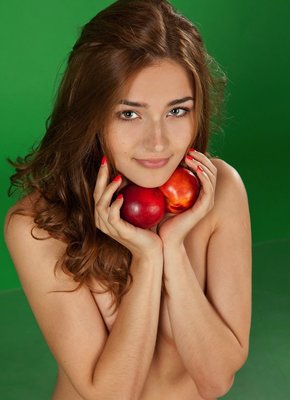 Описание: Совершенно голая и обворожительная девушка с каштановыми густыми волосами, улыбаясь и строя глазки фотографу, обольстительно позирует на полу в фото студии с персиками, особенно откровенно демонстрируя натуральные дойки. Не скрывая свою радость от съёмки, сексуальная девушка смело раздвигала промежность и так же показывала бритую письку.