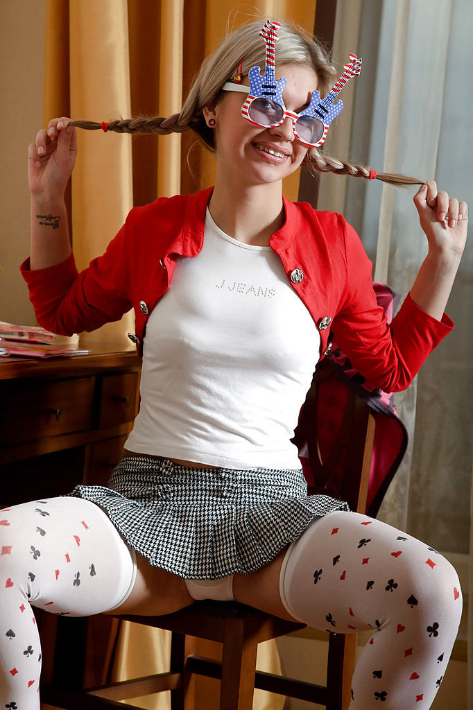 Девочка в забавном наряде и смешных чулочках думает не об учебе, а о любимой резиной игрушке солидного размера. Облизав пенис, сладкая Marcie растянула себе все дырки, долго и неистово насаживаясь вагиной и попочкой на большое резиновое чудо.